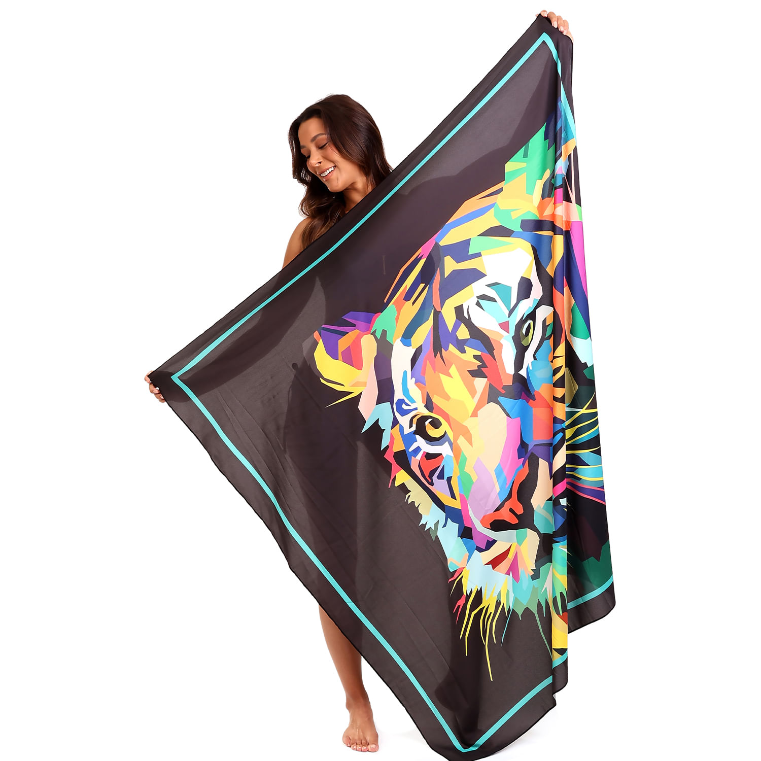 A Marcyn apresenta sua coleção Aurora, trazendo sua Canga Abstrata, perfeita para completar seus looks de praia com originalidade. Com fundo preto e estampa abstrata de leão, ela traduz a força e a beleza da estação em uma peça leve e cheia de personalidade.