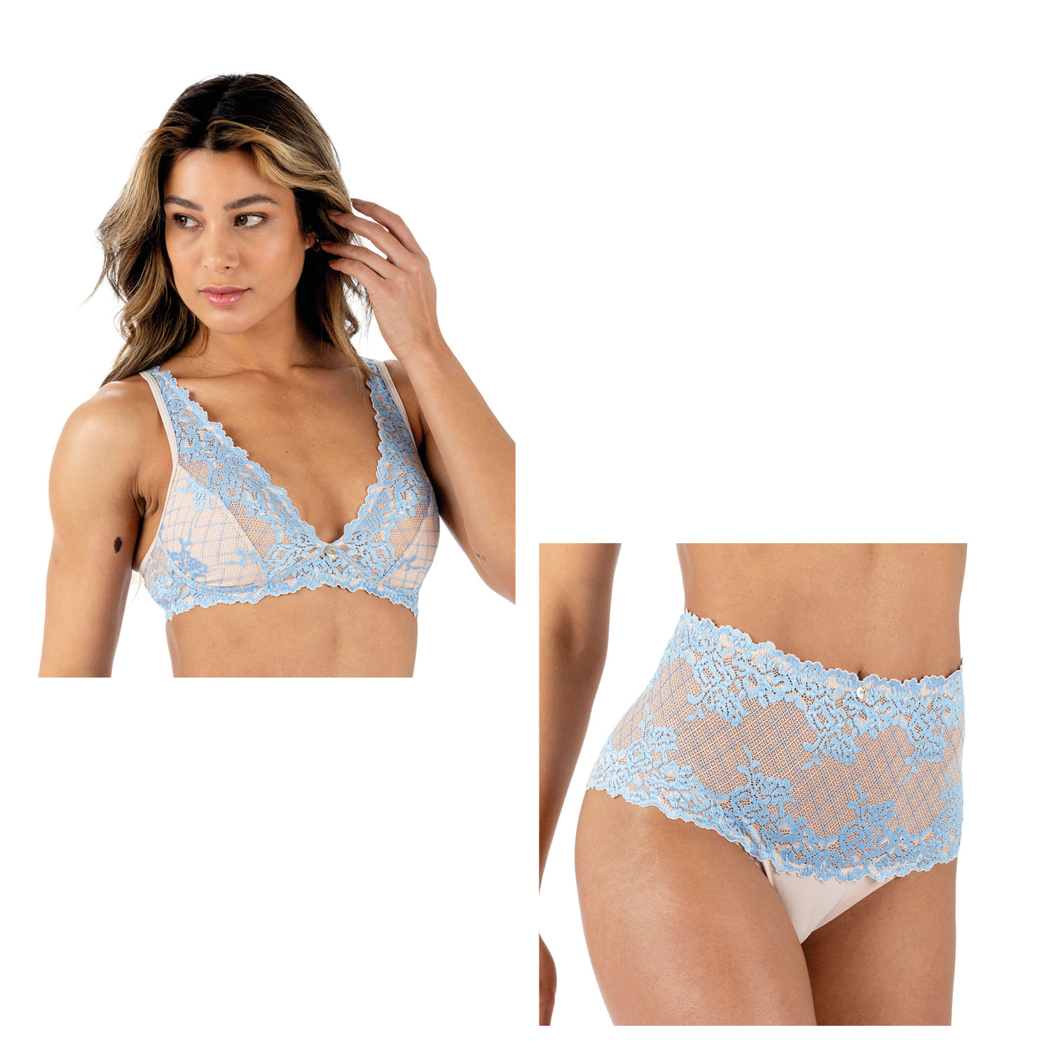 O Kit Sutiã Top e Calcinha Alta Califórnia une delicadeza e sofisticação em renda bicolor. Inspirada no charme e na leveza da costa californiana, esta coleção combina elegância e conforto em cada detalhe.