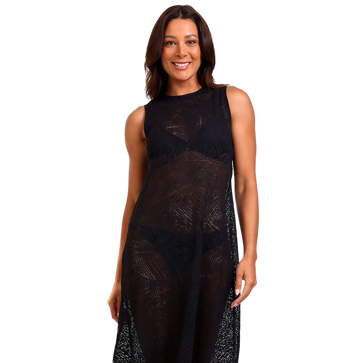 Confeccionada em 90% poliamida e 10% elastano. A peça combina maciez e elasticidade em um caimento impecável. Com modelagem longa, gola careca e sem mangas, garante frescor e praticidade, enquanto a renda confere charme delicado e atemporal.